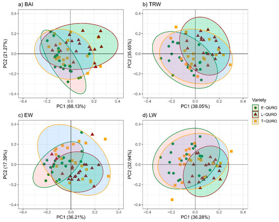 Inter-variety differences were examined by subjecting the data for the 2010–2019 period to PCA analysis, which revealed stronger deviations in BAI and TRW (Figure 4a,b) relative to EW and LW (Figure 4c,d). Based on the BAI and TRW chronologies, more pronounced differences were noted between L-QURO and E-QURO relative to T-QURO.