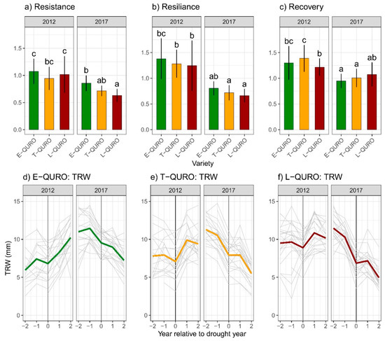 The (a) resistance, (b) resilience, and (c) recovery indices of QURO varieties during the 2012 and 2017 drought events with HSD Tukey post-hoc tests (p < 0.001). Also shown are the 5-year TRW chronologies during the two drought events for (d) E-QURO, (e) T-QURO, and (f) L-QURO.
