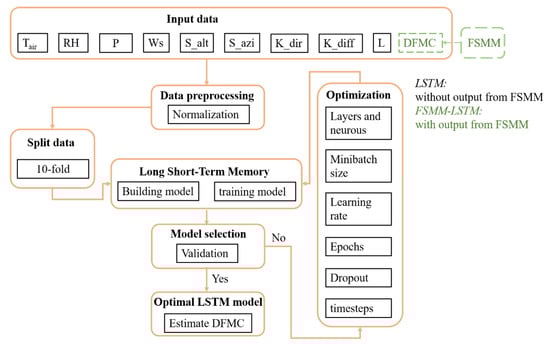 We combined FSMM (process-based model) and LSTM (empirical model) to estimate 10-h DFMC (hereafter ‘FSMM-LSTM’). FSMM was selected as the fundamental process, because of its good performance across all size fuels [49]. Usually, FSMM estimates the DFMC at a certain time t, based on DFMC value at the last time t–1 [50]. On the other hand, the temporal dynamic information of DFMC can be mined by hourly iterations [51], and this dynamic information can be well processed by the LSTM algorithm [52]. Thus, LSTM was selected as the empirical model to estimate DFMC [52]. Figure 1 shows the flowchart of the DFMC estimation algorithms, including LSTM and FSMM-LSTM.