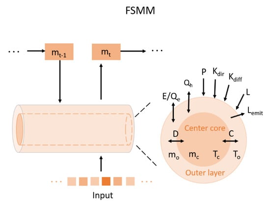 FSMM is a process-based model proposed by D.W. van der Kamp et al. (2017) [49]. With hourly measurements of relative humidity, air temperature, precipitation, wind speed, shortwave radiation and longwave radiation, FSMM can estimate DFMC of fuels at multiple sizes, particularly including the 10-h fuel. In this model, dead fuel was divided into two zones: an outer part that responds to atmospheric forcing, and a central core that only trades water and energy with the outer layer. The schematic of FSMM is shown in Figure 2 and the diagram of the directed graph of FSMM is shown in Figure 3. Based on an initial value mt−1, FSMM can estimate the DFMC at t (mt) with hourly input variables and subsequently based on mt, the value at t + 1 (mt+1) can be estimated as well. The water content of the outer layer and the core was named mo and mc, respectively. In addition, the temperatures of them were named To and Tc. Then the average temperature, Ts and the moisture content, ms of the fuel can be calculated as: