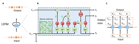 The LSTM network is developed based on the standard RNN [53], which has good performance in describing the temporal dynamic changes of the time-sequential data such as DFMC. The LSTM model was proposed to solve the problem of gradient vanishing as well as the explosion of long-term dependences in traditional the RNN networks [45]. The schematic of LSTM is shown in Figure 4. The LSTM network computed a mapping from an input sequence to an output sequence (Figure 4A).