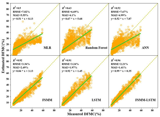 To compare the performance of the six models in time-series more accurately, we provide their time series pattern in Figure 7. The MLR model is still the worst, which will overestimate or underestimate the DFMC. The results, estimated by random forest and ANN algorithms, can basically agree with measurements in the time series, but there are still plenty of significant overestimations and underestimations. Furthermore, the process-based FSMM model, generates a satisfying result, except for the underestimates from May 20 to May 28 and August 14 to 16. The LSTM model generally shares a similar underestimation as FSMM, but it is more minor. The FSMM-LSTM algorithm still achieved the best results, that the estimated results are in perfect agreement with the measured values, with no overestimations and underestimations over the entire time series.