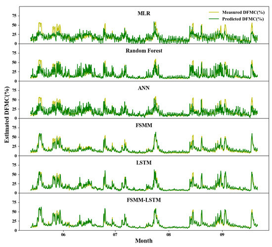 The time series patterns of DFMC predicted by six models, the gold line is measured DFMC and the green line represents predicted DFMC.