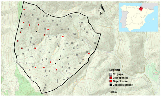 Canopy cover was assessed both in 2006 and 2016, estimating the proportion of the plot covered by the canopy trees (in percentage). We defined canopy gaps as openings in the canopy layer with a cover lower or equal to 80% that were created by the death of one or more trees [41,42]. We considered that a plot had a gap when the vertical projection of the gap fell on the plot [33,42]. The identification of canopy gaps was carried out directly in the field (Figure S1) and was based on expert criteria (R. Ibáñez and A. Gazol, personal observations). To confirm that the canopy openings really were created by tree death and not by the presence of streams or other topographic factors, we checked for the presence of dead tree remains (i.e., fallen logs or stumps) [41] and used aerial photographs to check for tree fall events (Figure S2). The reason for choosing an 80% threshold to define canopy gaps was based on the fact that all the gaps identified as such in the field had an opening in the canopy greater than 20%. In contrast, for canopy openings smaller than 20%, we could not guarantee that the cause of lower canopy coverage was actually tree death. In addition, we were more interested in the effects of intensive disturbance (i.e., large gaps), which seems to have a greater influence on forest dynamics than small gaps, as small gaps tend to close rapidly following beech lateral crown growth [33,43]. Hereafter, we classified plots in four categories according to the presence or absence of gaps in the two years studied (Figure 1), as a proxy of gap dynamics in a decade: plots opened both in 2006 and 2016 (i.e., gap persistence), plots closed both in 2006 and 2016 (i.e., no gaps), plots closed in 2006 but opened in 2016 (i.e., gap opening), and plots opened in 2006 but closed in 2016 (i.e., gap closure).