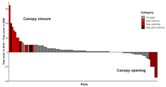 Difference in the percentage of tree layer cover in each plot between 2016 and 2006. Plots are ordered from positive differences in tree cover (i.e., canopy closure) to negative differences (i.e., canopy opening), and are classified in four categories: “no gaps” if there are no gaps in 2006 nor in 2016, “gap closure” if a gap present in 2006 is closed in 2016, “gap opening” if a new gap appears from 2006 to 2016 and “gap persistence” if the gap is present both in 2006 and 2016.