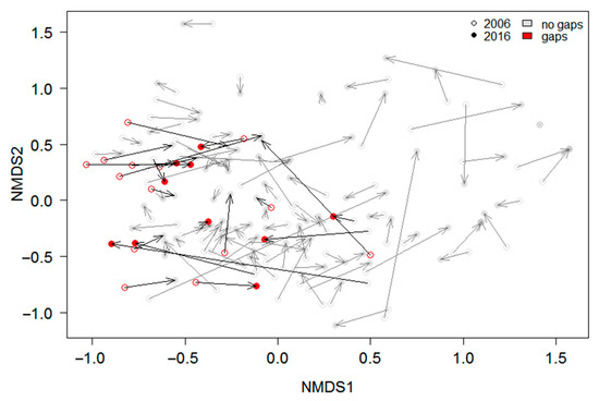 NMDS plot showing changes in understory species composition from 2006 to 2016. Circles represent relevé plots. Each arrow connects the same plot in 2006 and 2016. Red colour indicates if the plot has a gap in 2006 (empty circles) or 2016 (filled circles). Grey colour indicates no gap. Stress = 0.2. Iterations = 91.