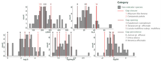 Histograms showing the trait values (LDMC: leaf dry matter content, SLA: specific leaf area, logLS: logarithm of leaf size, logHeight: logarithm of plant height, logSM: logarithm of seed mass) of the species found in the understory of the Bertiz forest. Grey bars show the trait values of the species not selected as indicators, while lines indicate the trait values of the species selected as indicators of gap closure, gap opening and gap persistence.