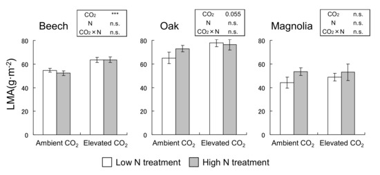 The LMA of beech leaves significantly increased under eCO2 (p < 0.001) (Figure 1). In oak, the LMA tended to increase under eCO2 (p = 0.055). No significant differences were observed in both beech and oak treated with N loading. In magnolia, there were no significant differences in response to both CO2 and N treatments. Moreover, no significant interactive effects of CO2 and N on LMA were demonstrated by all species (Figure 1).