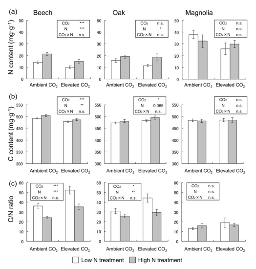 The N content of beech significantly decreased under eCO2 and significantly increased with high N treatment (p < 0.001) (Figure 2a). No difference in the N content of oak leaves was observed between each CO2 treatment, but the N content of its leaves significantly increased at high N treatment (p < 0.05) (Figure 2a). The C content of beech leaves significantly decreased under eCO2 (p < 0.001) and significantly increased at high N treatment (p < 0.01). The C content of oak increased significantly under eCO2 (p < 0.05) and tended to increase at high N treatment (p = 0.065) (Figure 2b). The C/N ratio increased under eCO2 treatment and decreased under high N treatment in both beech and oak (Figure 2c). In magnolia, there were no significant differences in response of the N and C contents, and C/N ratio to both eCO2 and N treatments. There were no significant interactive effects of CO2 and N loading on the N content, C content, and C/N ratio in all species (Figure 2).