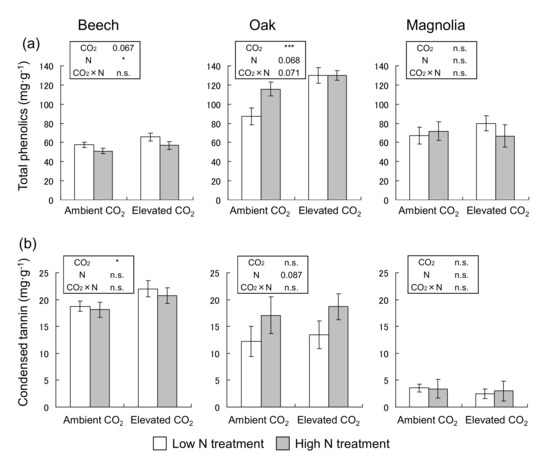 The condensed tannin of beech leaves significantly increased under eCO2 treatment (p < 0.05), but no differences were observed between each N treatment (Figure 3b). Although there were no significant differences in the response of oak leaves to both CO2 and N treatments, condensed tannin tended to increase at high N treatment (p = 0.087). In magnolia, there were no significant differences in the condensed tannin under both eCO2 and N treatments (Figure 3b). The concentration of condensed tannin in magnolia was remarkably lower than in the other two species. No significant interactive effects of CO2 and total phenolics and condensed tannin in all species were observed, except in oak (Figure 3).