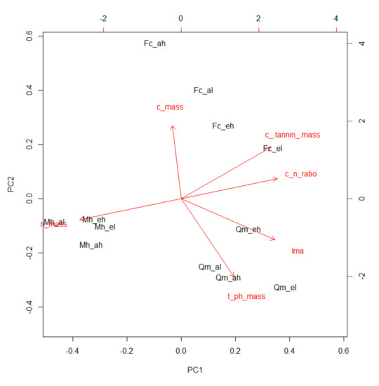 The cumulative proportion of PC1 and PC2 variance was 0.80, and the proportion of variance was 0.56 in PC1 and 0.24 in PC2 (Figure 4). Factor loadings of PC1 and PC2 were shown in Table 2. PC1 had strong positive correlation among LMA, C/N ratio, and mass bae content of condensed tannin, while strong negative correlation was observed in mass base N content (Table 2). PC2 had positive correlation in mass base C content, but also negative correction in condensed tannin (Table 2).