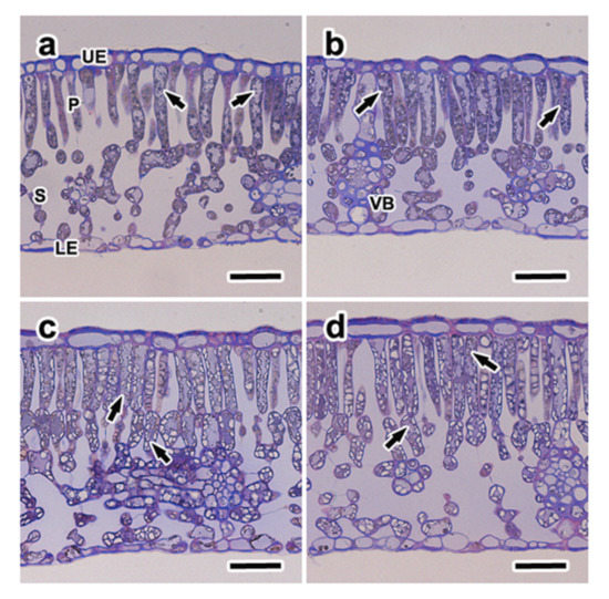 Micrographs of the cross sections of beech (Fagus crenata) leaves in all treatments. These sections were double-stained with safranin and gentian violet. (a) Ambient CO2 and low nitrogen, (b) ambient CO2 and high nitrogen, (c) elevated CO2 and low nitrogen, and (d) elevated CO2 and high nitrogen. The arrows indicate phenolic compounds. LE; lower epidermis, P; palisade layer, S; spongy parenchyma, UE; upper epidermis, VB; vascular bundle, scale bars = 20 µm.