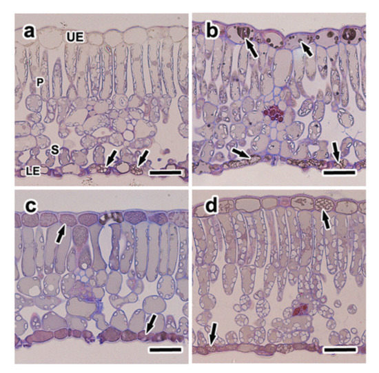 Micrographs of the cross sections of oak (Quercus mongolica) leaves in all treatments. These sections were double-stained with safranin and gentian violet. (a) Ambient CO2 and low nitrogen, (b) ambient CO2 and high nitrogen, (c) elevated CO2 and low nitrogen, and (d) elevated CO2 and high nitrogen. The arrows indicate phenolic compounds. LE; lower epidermis, P; palisade layer, S; spongy parenchyma, UE; upper epidermis, scale bars = 20 µm.