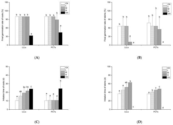 | Final germination of roots | 0 | 0 | 0 | −0.67 | 0 | 0 | −0.11 | −0.56 |