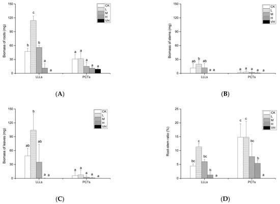 3.3. Effects of LLLs and PCTs from K. obovata on Biomasses of A. corniculatum Roots, Stems, Leaves, and Root–Stem Ratio