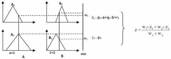 The input values of the fuzzy variables A and B, i.e., a = 3 and b = 2, are singletons to which the T-norm operator (min) is applied to determine the firing strength of each rule (left-hand side of Figure 1). The min operator stablishes the weights, w1 and w2, associated with each rule, which are then used to obtain the output of the inference process, i.e., z (right-hand side of Figure 1), by a weighted average equation.