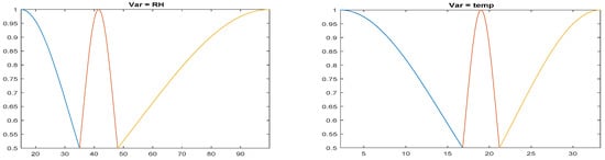 Fuzzy sets of the five relevant input variables: RH, temperature, FFCM, rain and wind for the ANFIS models. Only the range 0.5–1 is plotted to show membership functions more clearly.