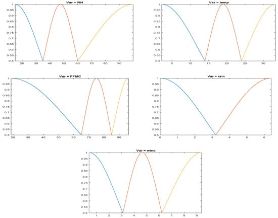 Notice that the membership functions of the FFMC variable were those with a less uniform distribution, which was due to the characteristics of the available data. The FFMC variable had the vast majority of the data in the 90–100 range. FIR determined that a representation of fuzzy sets where the data was distributed in a similar proportion to each membership function is the one that provided the best predictive power. The fuzzy sets of the input variables resulting from the ANFIS models training process are shown in Figure 3.