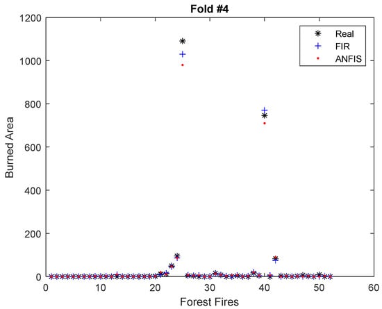 As explained before, a 10-fold cross-validation was performed and repeated 10 times for both FIR and the ANFIS. Figure 4 and Figure 5 show graphically the results of the FIR and ANFIS models for two folds of the dataset, #2 and #4. Figure 4 presents a fold that contained forest fires with high burned areas. The RMSE obtained by the FIR and ANFIS models in this fold was 69.17 and 110.10, respectively.