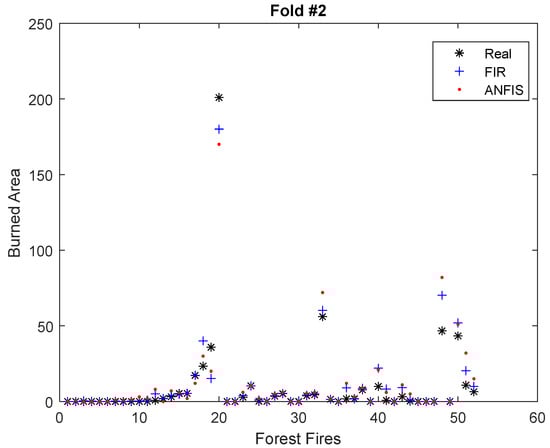 In Figure 5, fold #2 is presented, where forest fires were of a lower magnitude and therefore had a much lower burned area. The RMSE obtained by FIR and the ANFIS in this fold was 46.95 and 61.83, respectively.