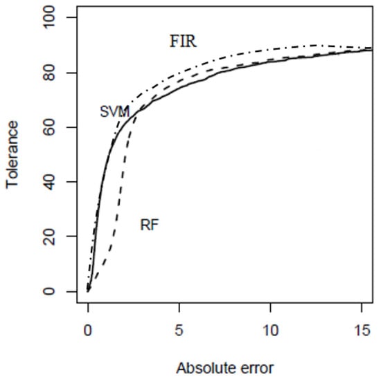In fact, this result coincided with the conclusions of Cortez et al. [17], who said that the weather variables were the most relevant. Figure 6 presents the REC curves obtained by the RF and SVM of Cortez et al. [18] and FIR models, which are the methodologies that produced better MAE–RMSE relation accuracy.