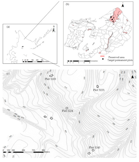Locations of the study area and plots. (a) University of Tokyo Hokkaido Forest (UTHF) of Hokkaido island of Japan; (b) preserved area and permanent plots of the UTHF; (c) contour map of the four preserved permanent plots of UTHF.