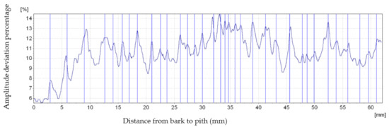 Figure 2 shows the annual rings in one living A. sachalinensis tree detected using the DECOMTM software. RESISTOGRAPH measurements were ineffective for severely rotten and center-decayed trees, for which we established the regression equation between the age after in-growth (y) and the radius −2.5 cm (w) [40]. Next, the age after in-growth was estimated by inputting the radius data into simple three-dimensional equations fitted to a scatter diagram (Table 2). This method was followed for 20% of the sample trees. Table 3 further illustrates the method applied to determine the in-growth years of trees.