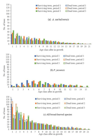 In Figure 3, the age distributions of A. sachalinensis and broad-leaved species show exponential shapes, with few outliers in some periods, whereas P. jezoensis shows an irregular multi-modal shape in each period. Remarkably, fewer new in-growths of coniferous species were found compared with those of broad-leaved species. Considering these matters, it appears that A. sachalinensis might not keep the current exponential shape and change to the multi-modal shape in the upcoming periods. In addition, larger numbers of dead trees and new in-growth trees were observed in broad-leaved species compared with conifer species over these periods. These results could not fully support the suggestion that the dominance of coniferous species would decrease further with climate change in northern Hokkaido, as found by Hiura et al. [50].