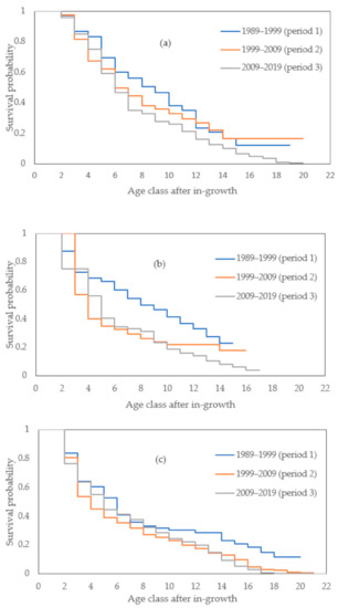 Kaplan–Meier curves showing tree survival probabilities during the three observational periods: (a) A. sachalinensis, (b) P. jezoensis, and (c) all broad-leaved species.