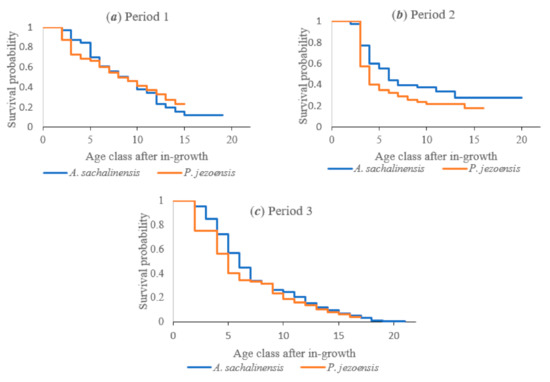 Kaplan–Meier curves showing tree survival probabilities of A. sachalinensis and P. jezoensis during the three observational periods: (a) period 1, (b) period 2, and (c) period 3.