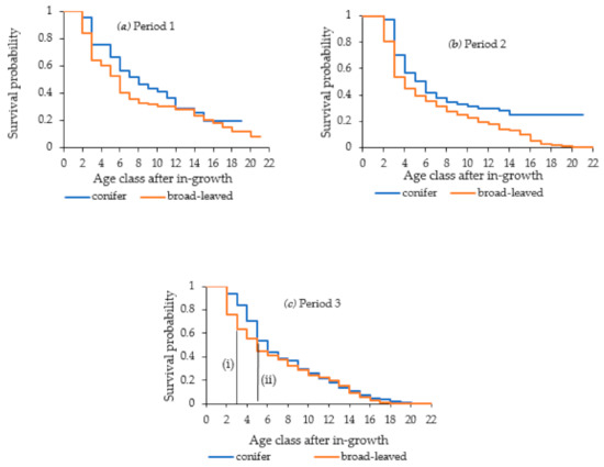 Kaplan–Meier curves for each period for conifers and broad-leaved trees: (a) period 1, (b) period 2, and (c) period 3 (i and ii denotes the starting age classes of “practical” mean lifetime of each broad-leaved and coniferous species, respectively).