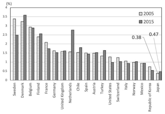 In Japan, it takes about 50 years from planting to harvesting. However, during the past 50 years, Japanese lifestyles and economic conditions have changed dramatically. In urban areas, reinforced concrete housing complexes instead of wooden houses have become the main way of living [49]. As a result, the demand for wood for housing has decreased. In addition, Japan’s mountain forests have many steep slopes, and the cost of producing lumber is relatively high, making domestic lumber more expensive than imported lumber and making it uncompetitive. Currently, the cost of managing production forests exceeds the selling price of timber, and there are many production forests that are poorly managed and production activities have stagnated. Figure 2 shows the ratio of timber production to forest accumulation in the OECD (Organization for Economic Cooperation and Development) countries [50]. Japan has the lowest ratio of wood production to forest accumulation among the OECD countries, at only 0.47% in 2015. This is about one-tenth of Scandinavia, which has the highest amount of wood production relative to forest accumulation and is the lowest. Table 3 shows this in figures. Japan’s wood production to forest accumulation was only 39.17% in 2015 compared to the average of OECD countries.
