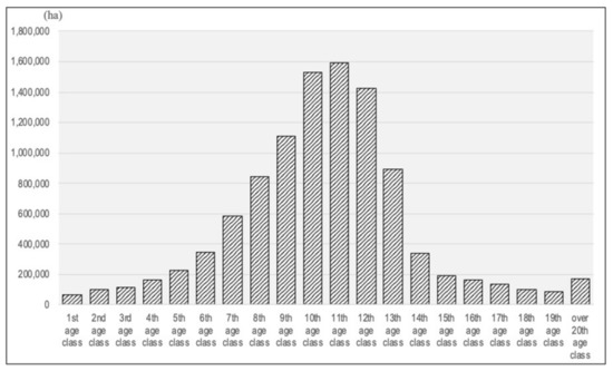 In Japanese forestry (practice), forests are classified into age classes that have 5 years width. The highest possible age class is 20 with a final age of 100 years. Figure 3 shows the age classes of Japan’s production forests in 2017. The area occupied by the 10th–12th age classes is the largest among the production forests, indicating that afforestation was actively carried out in the late 1960s and 1970s. Today, 50 to 60 years have passed since the time of planting, and most of the trees are in a condition suitable for logging.