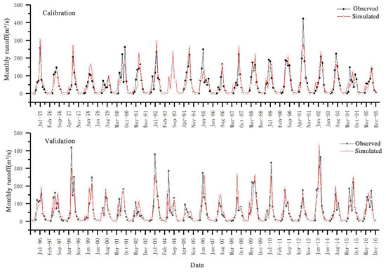 Comparison between simulated and measured monthly runoff in calibration and validation period.