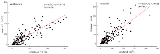 Scatter plots of the simulated and observed values during the calibration and validation.
