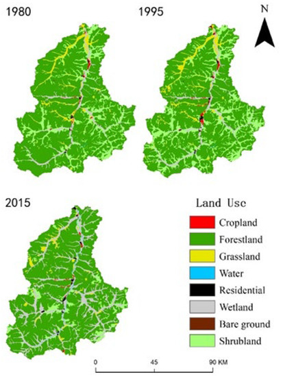 In the past 40 years, the area of forestlands in the Tahe River Basin first decreased and then increased, from 76.43% in 1980 to 70.44% in 1995 and then to 74.06% in 2015. These dynamic changes reflect the real-world implementation of large-scale deforestation in 1980 and the implementation of natural forest protection projects beginning in 2000 in the Da Hinggan Mountains. In addition to the changes in forestlands, the transformation of shrublands and grasslands to wetlands has caused the land use pattern of the basin to change substantially.