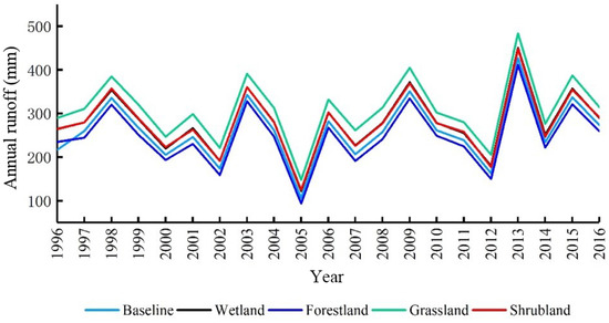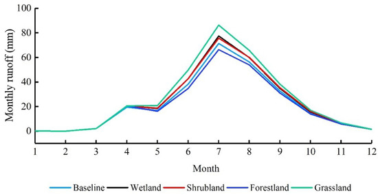 To further analyze the impacts of the main land-use types on runoff in the Tahe River Basin, four land-use types (forestlands, shrublands, grasslands, and wetlands) were selected to construct extreme scenarios (Table 1) according to the compositions of these land-use types and their changes from 1980–2015. The land-use scenario in 2015 was selected as the reference period and driven by the meteorological data from 1996–2016 to simulate the annual runoff. It can be seen from Figure 5 that the annual runoff simulated under each scenario exhibited similar trends. The water yield under the four extreme land-use types was the highest in grasslands, followed by wetlands, shrublands, and finally, forestlands. The mean annual runoff for these land-use types were 308.62 mm, 279.10 mm, 278.89 mm, and 246.26 mm, respectively, and the difference between grasslands and forestlands was 62.36 mm. Meanwhile, the difference between wetlands and shrublands was only 0.21 mm. Compared with the base period, runoff in the grasslands, wetlands, and shrublands increased by 19.06%, 7.67%, and 7.59% respectively. The forestland scenario showed the opposite trend, with its mean annual runoff declining by 5.00% compared to the base period. In addition to the mean annual runoff, the difference in runoff between land-use types showed different characteristics in each month (Figure 6). Some land-use types had more severe impacts on snowmelt (in April and May) and summer runoff (June–August), but had lesser impacts on winter runoff (December–February).