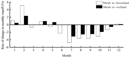 Taking the simulated monthly runoff under the 2015 land-use scenario as the benchmark, the rate of change between the simulated monthly runoff and the reference period under two future scenarios is shown in Figure 7. Overall, the response intensity of monthly runoff to the shrubland to forestland scenario was greater than that to the shrubland to wetland scenario, but the changes in different months are varied. In the shrubland to forestland scenario, the runoff in January, February, April, and December was higher than during the base period, while in the other months, it was less than in the base period. The rate of change was the greatest in February, and was 5.11% higher than the base period. In the shrubland to wetland scenario, the runoff from July–November was lower than during the base period, while that during the other months was higher. The rate of change was the greatest in July, and was 3.09% lower than during the base period. Compared with the land-use scenario in 2015, two future scenarios yielded better adjustments to monthly runoff, which were manifest in the replenishment of winter runoff (December–February of the next year) and the reduction of summer (June–August) peak flood runoff; the former increased runoff by 5.11% in the dry season (February), while the latter increased runoff by 2.35%, and during the peak flood period (July), the former reduced runoff by 4.75% and the latter reduced runoff by 3.09%. Compared with shrublands, forestlands and wetlands reducing flood and enhance dryness, with the effect of forestlands being stronger than that of wetlands.