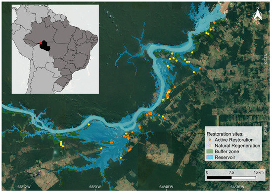 Active restoration and natural regeneration sites sampled in the buffer zone of the Jirau Hydroelectric Reservoir along the upper Madeira River, Rondônia State (Brazil).