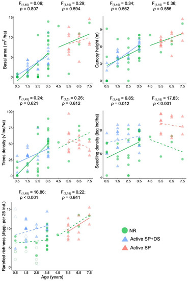 We calculated basal area (m2/ha), density of trees and seedlings (ind/ha), and canopy height (m). The basal area was calculated including all tree stems (height > 2 m). The canopy height was defined as the upper decile of the height of trees sampled in each site. We calculated the rarefied species richness per 25 individuals, which was the lowest number of individuals of all plots, to allow direct comparisons between active restoration and natural regeneration. The comparisons between active restoration and natural regeneration were made separately for younger and older sites in order to consider the two different methods of active restoration: NR × Active SP (for 4.5–7.5 y-old sites) and NR × Active SP+DS (for 0.5–3.5 y-old sites). We performed ANCOVAs to assess difference in vegetation attributes between the two restoration methods, considering age as a co-variable. Density of trees and seedlings were square-root and log-transformed, respectively, to meet model assumptions.