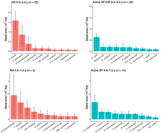 Basal area (mean ± standard error) of the ten most dominant species sampled in sites of natural regeneration (31) and active restoration (36) located in the south of Jirau Hydroelectric Reservoir, along the upper Madeira River. For 0.5–3.5-y-old sites, active restoration included seedling planting and direct seeding of pioneer species (Active SP+DS) and for 4.5–7.5-y-old sites, it included only seedling plantings (Active SP). Species with an asterisk (*) were planted as seedlings in active restoration sites.