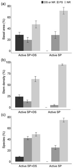 In active restoration sites, planted seedlings had a moderate contribution to basal area and stem density, reaching less than 30% of the basal area and 14% of the total stems in both AR SP+DS (younger) and AR SP sites (older; Figure 5a,b). Planted seedlings accounted for 42% of species richness in AR SP+DS, and for 25% in AR SP sites (Figure 5c). Natural regeneration dominated basal area, stem density, and species richness in active restoration sites (Figure 5). Direct seeding was applied only to 0.5–3.5-y-old sites. Seeded species, which could also be natural regeneration, contributed to 29% of the basal area, 24% of the stem density, and 9% of the species richness in AR PS+SD sites, where it was applied (Figure 5).