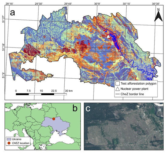Study area: (a) the Chernobyl Exclusion Zone (ChEZ) overlaid with a false-color Tasseled Cap composite (TCB, TCG, TCW); (b) the location of the ChEZ in Europe; and (c) an example of a very high-resolution (2017) image from Google Earth for a test afforestation polygon.