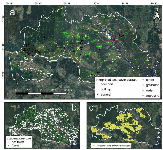 We used a Random Forest (RF [24]) model built on data collected for the year 2017. A training dataset contained 1065 manually interpreted pixels (30 m spatial resolution) with seven assigned land cover classes: “bare soil”; “built-up”; “burned”; “forest”; “grassland”; “water bodies”; and “woodlands”. Pixels were randomly arranged across the ChEZ with a minimum 100 m distance between each one (Figure 2a). This dataset contained 100 pixels from the field observations in the central part of the ChEZ, 900 pixels interpreted using high-resolution images, and 65 pixels manually assigned to the known locations of rare land cover classes such as “water bodies”, “built-up”, and “burned”. The class “forest” was assigned to areas with dense tree cover (covering more than 50% of the pixel area) while the class “woodland” was assigned to areas with sparse forest cover (less than 50% of pixel area under the forest) or shrub cover. Pixels of the ground truth class “burned” were assigned to this class if they were in areas known to be severely disturbed by the massive wildfires that occurred in 2015–2016. The land cover for the pixels from the training sample were manually delineated by using the Google Earth application and the Collect Earth plugin [25]. The RF model was built by using the R-package “randomForest” with standard hyper-parameters (i.e., the number of decision trees in the model ensemble was 500 and the mtry value, which is number of predictors sampled at each decision tree node, was defined as the square root of the total number of model variables). We analyzed the trained RF model by using the out-of-bag overall error rate, user’s accuracies for specific land cover classes, and the relative importance of the variables used in the RF model to predict the land cover classes.