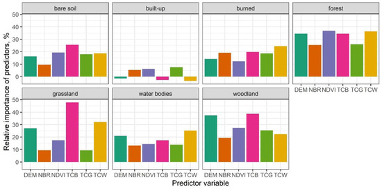 The out-of-bag estimate of the overall error for the trained RF model was 22.1%. According to the confusion matrix (Table 1), almost all land cover classes achieved 60–70% for the user’s accuracy, while the class “forest” was predicted with the best accuracy (90.4% user’s accuracy) and the class “bare soil” obtained the largest error (60.0% user’s accuracy). The large error that occurred for the land cover class “grassland” was related to the confusion with the “woodland” transitioning class, which is described by highly varying spectral characteristics. The drying landscape of the ChEZ cooling pond (formerly used for the nuclear power plant) may be contributing to the misclassification of “water bodies” as “grasslands” and the rarity of local sandy cover in the ChEZ may be contributing to the respective error for the “bare soil” class. The Tasseled Cap predictors (especially TCW and TCB) together with the DEM elevation were amongst the most important variables for all the land cover classes, while the NDVI and NBR contributed less to the prediction accuracies (Figure 3). The NDVI was better for delineating built-up areas. The predictor’s relative importance for the class “built-up” clearly illustrates how the low number of such training samples had a negative impact on the classification results.