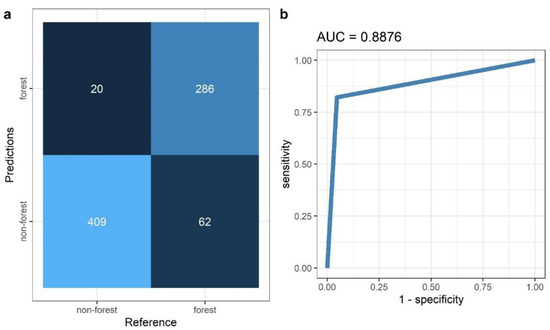 We applied this model to classify each annual stack of LT-fitted spectral values and the elevation from the DEM. In order to validate the model performance in a remote period before 2017 (for which the training data were obtained), we used a dataset of 777 pixels with two assigned classes: “forest” and “non-forest”. We only focused on these two land cover classes instead of the initial seven classes since the available data for land cover delineation were too coarse in resolution to permit different non-forest open landscape types to be properly distinguished (Figure 2b). These pixels were manually delineated by using the aforementioned SPOT-1 image available for 1988 as the “ground-truth” data. We extracted the respective values from our land cover dataset predicted for the same year and reclassified every class, except “forest” to “non-forest”.