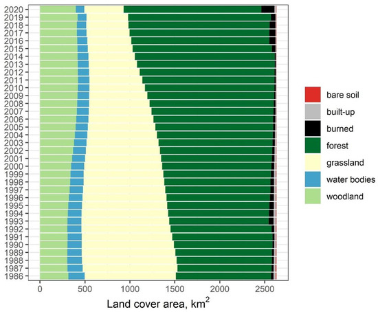 Land cover dynamics (1986–2020) predicted by the classification model applied to the LT-fitted spectral data set.