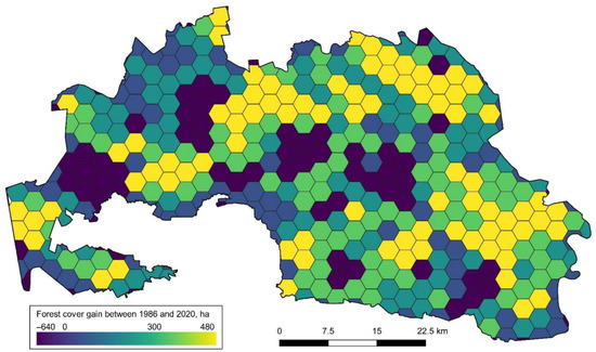 Hexagons where there have been no net forest cover gains compared to 1986 are not all associated with severely burned areas (Figure 6). For example, three hexagons in the southern part of the ChEZ show forest loss due to the flooding of trees and windstorms that occurred in 2016. Regarding burned areas, only the visual cluster of such hexagons located in the southeastern part of the ChEZ represents a large landscape cleared with salvage logging after a severe wildfire occurred in 1993. Other wildfire events (illustrated by dark purple hexagons in the western, northern, and central parts of the ChEZ in Figure 6) were not followed by any human interventions. The yellow hexagons on the map in Figure 6 (with net forest cover gain of up to 450 ha within each one) refer to the abandoned farmlands throughout the ChEZ.