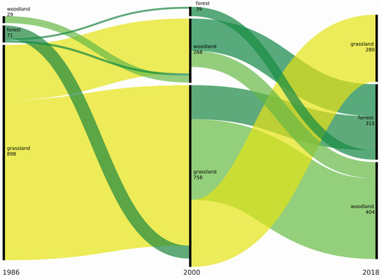 Additionally, we explored the land cover dynamics across three time points in time (1986, 2000, and 2018) by using our land cover maps for these years and a Sankey flowchart diagram. This figure shows how land cover changes through time for each pixel in the data set. In this case, the colors of the three main land cover classes (“forest”, “grassland”, and “woodland”) are defined by the land cover of pixels in 1986 (left part of the diagram) and in 2018 (right part of the diagram), while the year 2000 is presented only by the vertical axis. In order to build this flowchart, we used a data set of 1000 pixels randomly allocated within the mask of abandoned farmlands (Figure 2c). This mask was obtained by manually delineating former agricultural lands by using historical images for 1986. We performed this analysis with the aim of examining the rate of land cover transitions and afforestation within the abandoned farmlands.