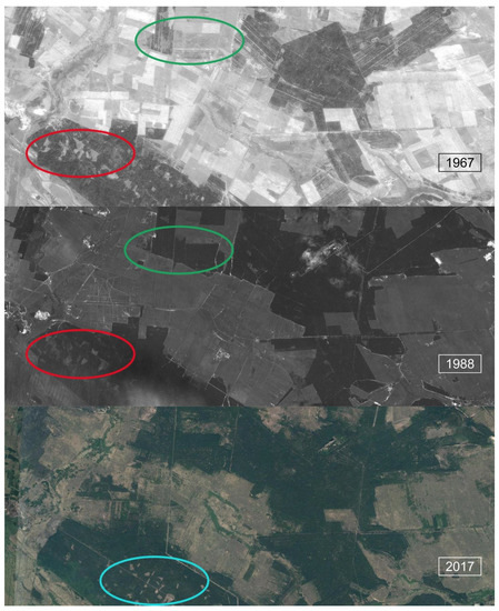 Forest cover increased 2.2 times (as of 2017) within the test site in the central part of the ChEZ compared to 1967 (Figure 8). Both a planting of new forest (northern part of the test site; marked by green) and an assisted reforestation of clear-cuts (southwestern part of the test site, marked by red) are visible on the 1988 image: these resulted in a 25% increase compared to 1967. Up to 2017, the most obvious reason for forest cover gain was the succession over the former farmlands, while some new clear-cuts (blue circle) can still be observed in the southwestern part of the test site.